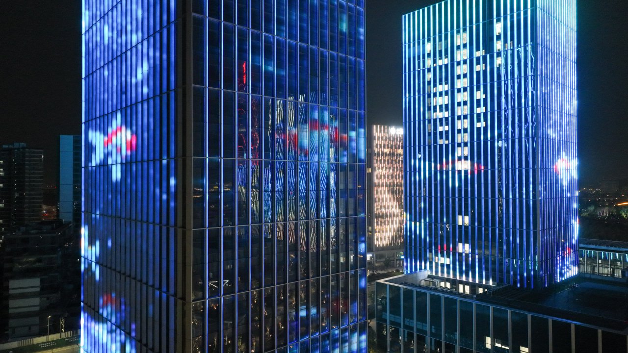 大樓玻璃幕墻泛光照明:采用LED點光源對大樓玻璃幕墻進行泛光照明,形成絢麗、多彩、動感的燈光效果,展現出大樓的現代化和創新性。點光源的顏色可根據節日或活動的需要進行變換,實現燈光的多樣性和個性化。