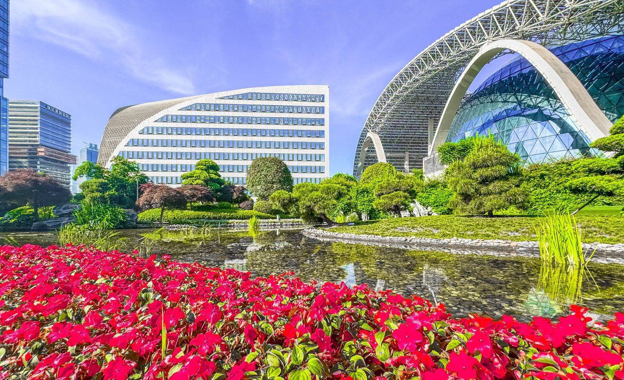 杭州國際博覽中心屋頂花園綠地面積超過5萬平方米,相當于8.5個標準足球場,水池面積約6420平方米,鋪裝園路面積約9473平方米,古建及風井面積約1000平方米,栽植各類苗木1萬余株、色塊苗100多萬株。